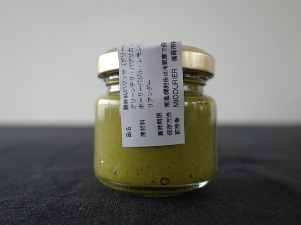原材料:グリーンチリ・オリーブオイル・セサミオイル・塩・コリアンダー・ホーリーバジル・レモンバジル・ヴェトナムミント・スペアミント・ディル・ジンジャー・ライムリーフ・カレーリーフ